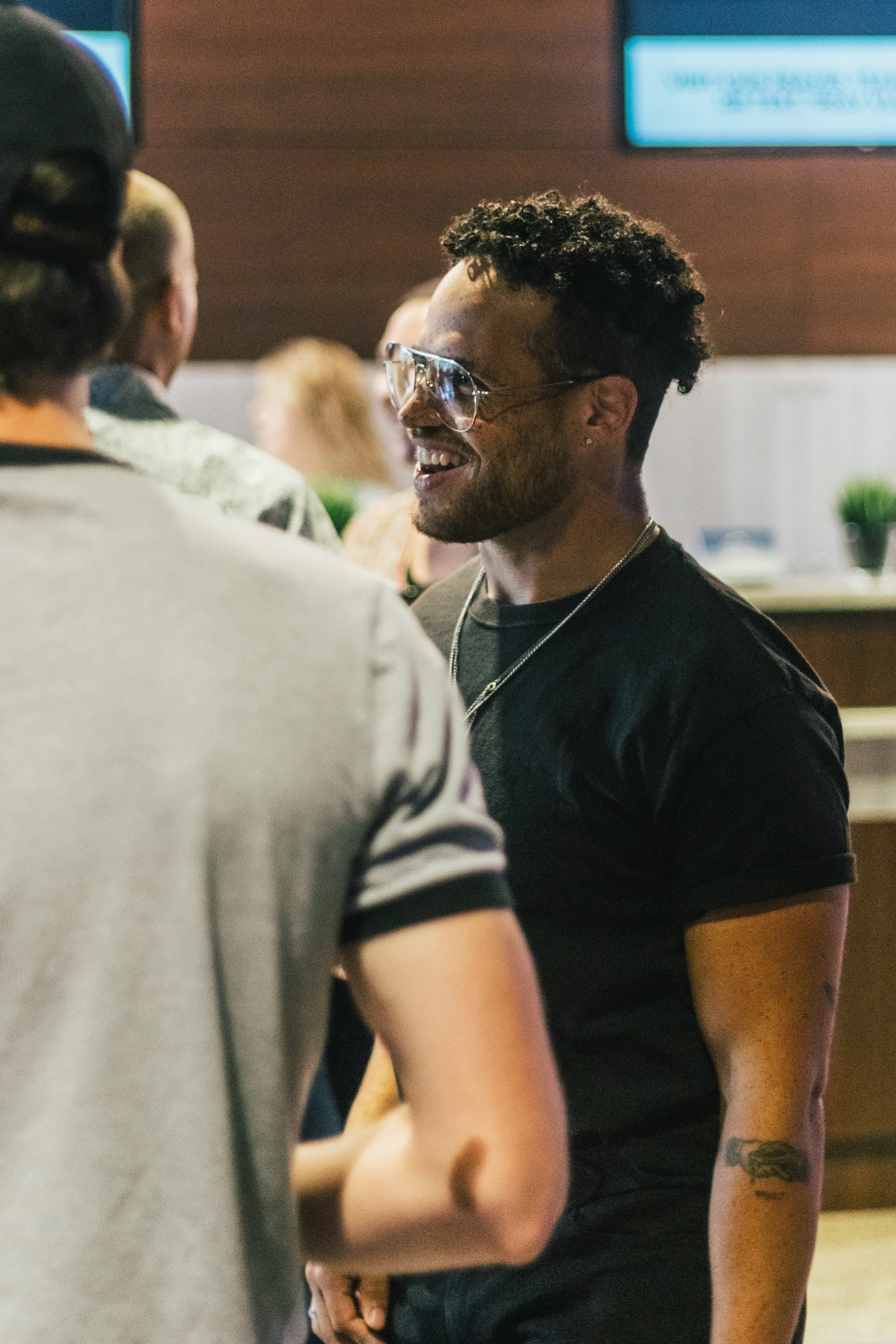 Student Director of Victory Life Church Battle Creek talking to a young person in Victory Life Church's Battle Creek Campus Lobby during our 9:15 am, 11:30am, and 12:30pm service